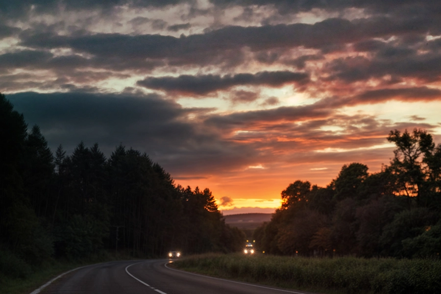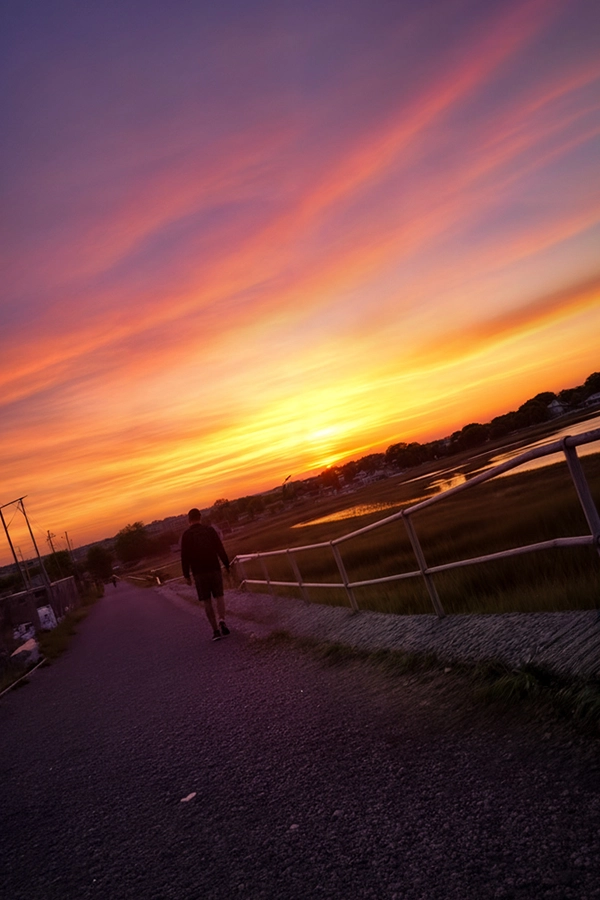 In The Road Less Traveled, Cerys Logie captures a winding road glowing under a sunset so stunning it could melt your tablet. The fiery sky bursts with oranges and pinks, framed by dark trees like nature showing off. Distant headlights hint at adventure ahead — a perfect invite to hit the road and see where it leads, hopefully somewhere with a good chippy.