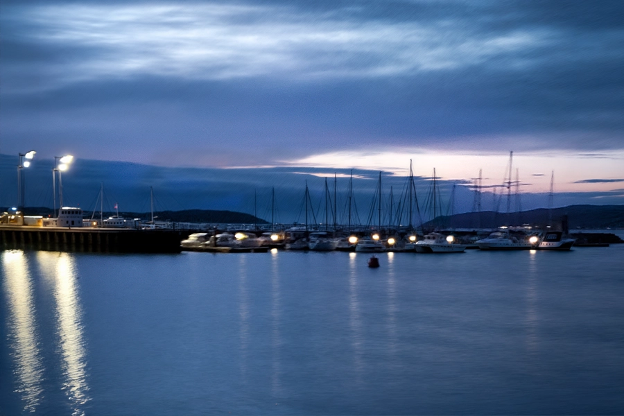 In Harbor Lights, Charley Boyd captures a peaceful evening at the marina, where soft lights shimmer on calm waters. Silhouetted boats line the docks, while gentle ripples add movement to the serene scene. Cool twilight tones blend sky and water, hinting at the day’s quiet end and inviting a moment of reflection. It’s a scene that celebrates the simple, tranquil beauty of coastal life — no rush, just calm.