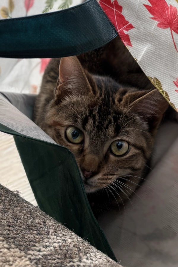 In Peekaboo Paws, Beth Blythe captures a curious cat peeking out of a patterned bag. Wide eyes and alert ears radiate mischief, while the soft textures of the bag contrast with sleek fur. Delicate floral details add charm, making the scene cosy and inviting. A perfect snapshot of feline playfulness — guaranteed to coax a smile from anyone watching.