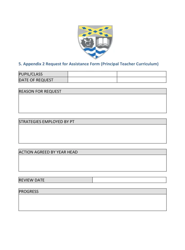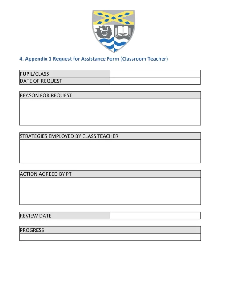 If, after a sustained period of support, there is little or no improvement in behaviour—whether from an individual pupil or across a class—the PTC may decide that further support is required from the appropriate Year Head. In such cases, the PTC will complete a Request for Assistance form, which will include details of the original staff referral as well as a summary of the strategies and interventions they have implemented to date.