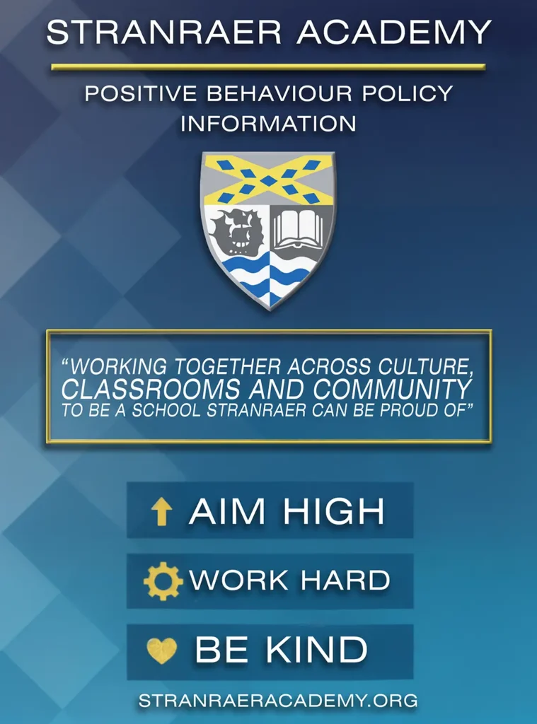 Click the image to download Stranraer Academy’s Positive Behaviour Policy. It sets out our commitment to a calm, safe and nurturing school where everyone feels valued. Rooted in our values of Aim High, Work Hard and Be Kind, the policy highlights how positive relationships, clear expectations and a culture of kindness help every learner thrive.